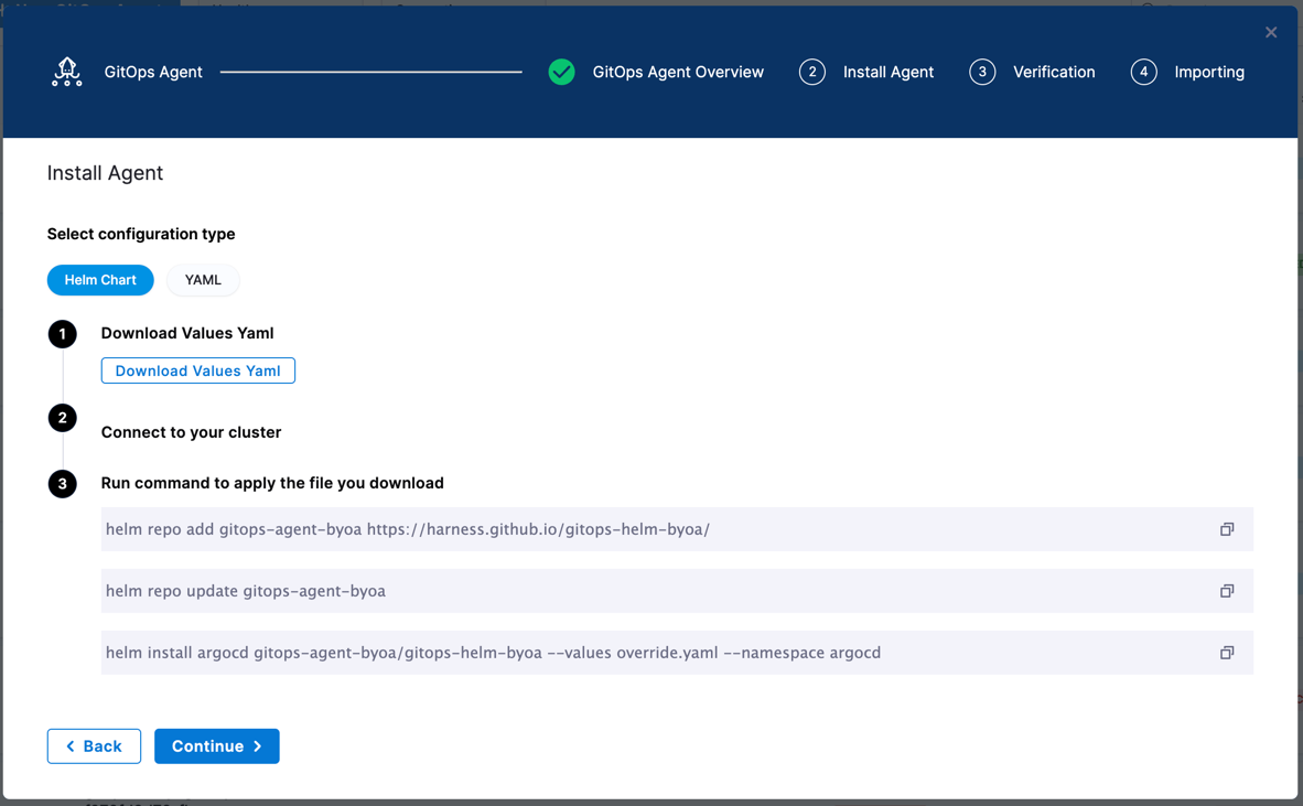 file for the Harness GitOps Agent. Download this file and pass it as values to the Helm chart.