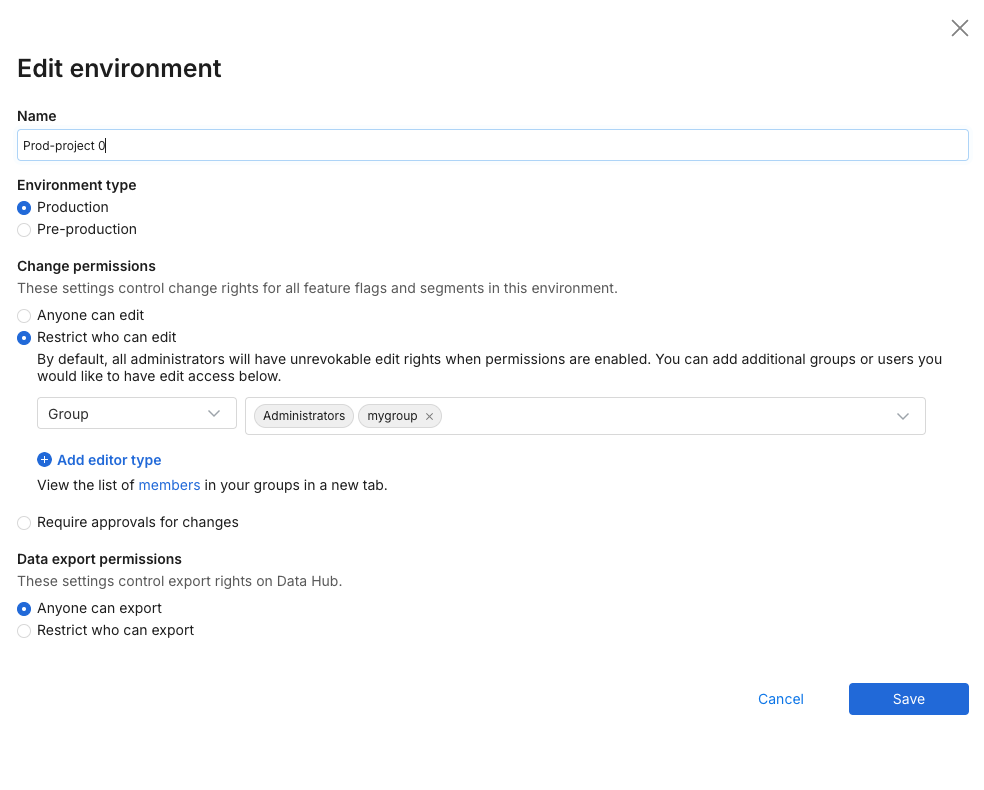 With this setting, you can select any groups or users to be editors for feature flags and segments in this environment. In an environment where change permissions are set to Restrict who can edit, only those added as editors can do the following: