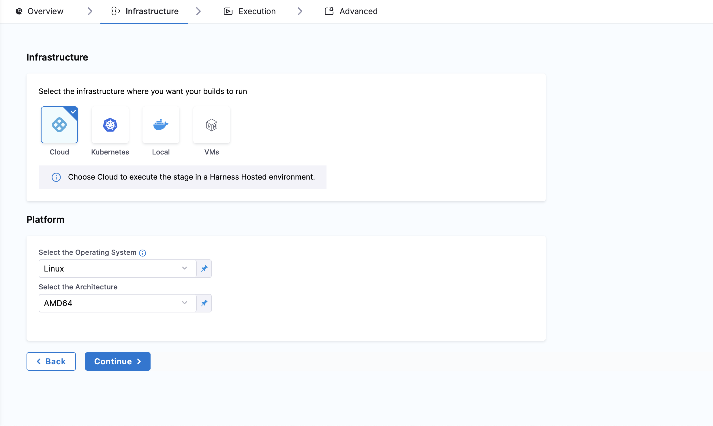 Under Infrastructure tab, Harness recommends Harness Cloud, but you can also use a Kubernetes cluster, local runner or self-managed AWS/GCP/Azure VM build infrastructure.