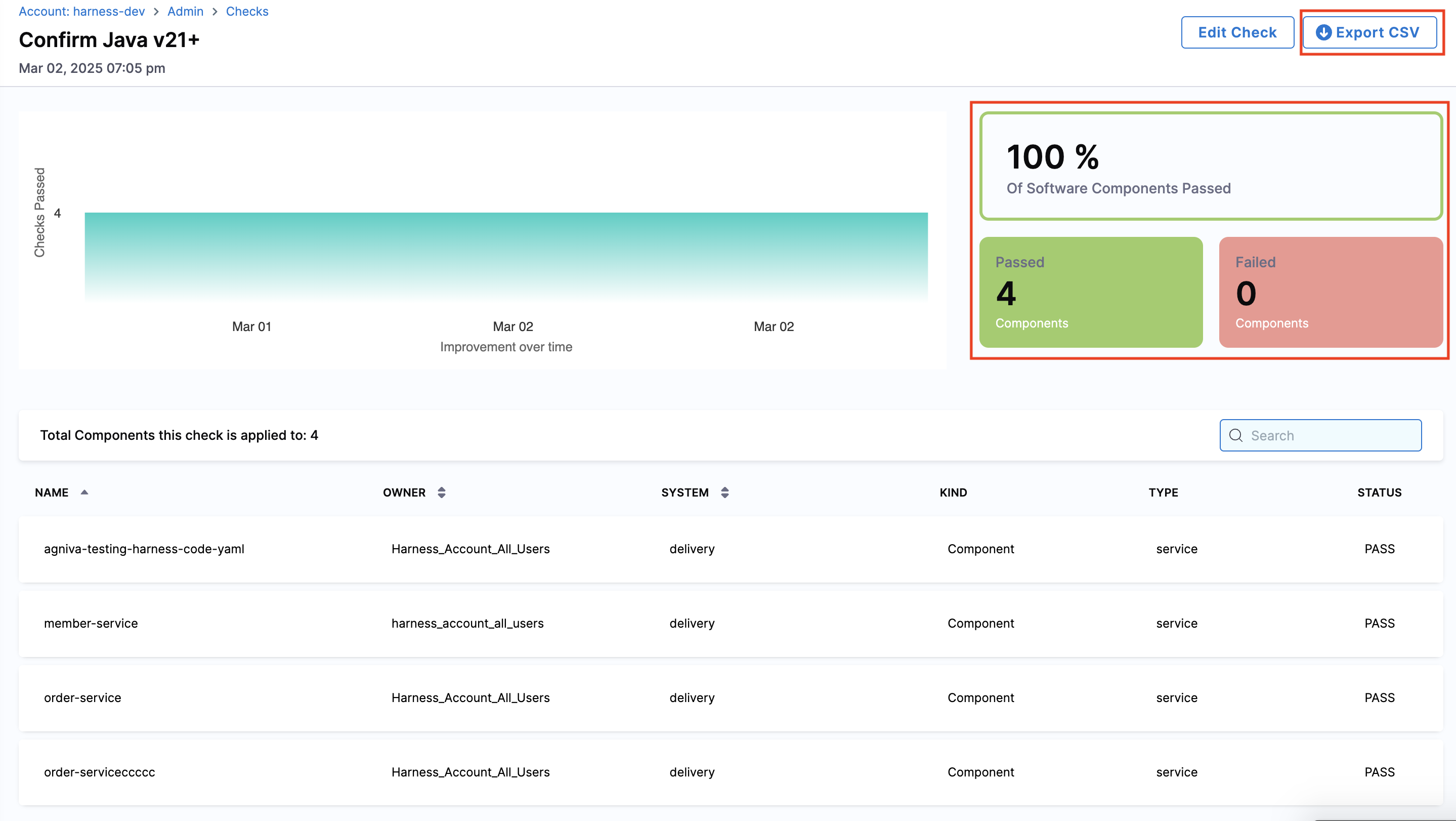The dashboard will open, displaying component-wise details and insights. You can export the aggregate data by clicking "Export CSV" to download it in CSV format.