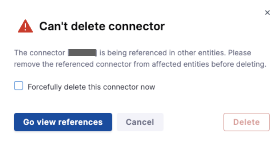 Connector is referenced in Harness entities - If your connector is referenced in a Pipeline or any other Harness entity, you can view the corresponding references or force delete it by selecting Forcefully delete this connector now.