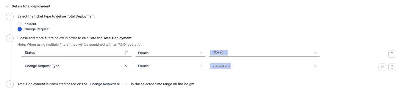 - Configure additional attributes to define deployments that result in failure or total deployments. When applying multiple filters, they will be combined using an 'AND' operation. A failed Deployment can be a hotfix or a deployment that led to failure.