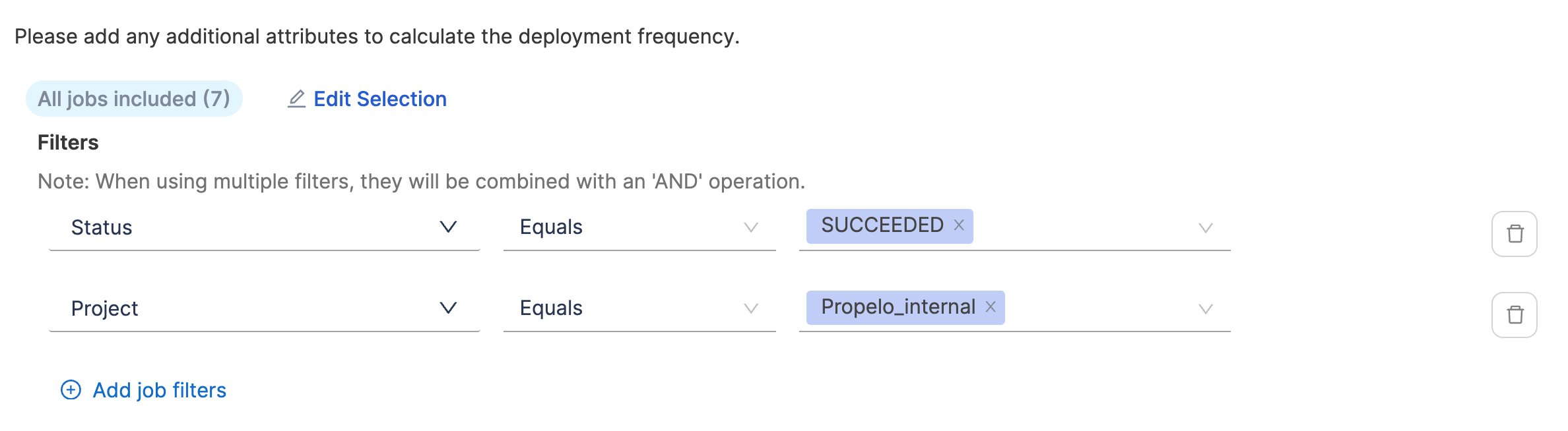 - Define additional attributes to identify deployments causing failure and total deployments. When using multiple filters, they will be combined with an 'AND' operation.
