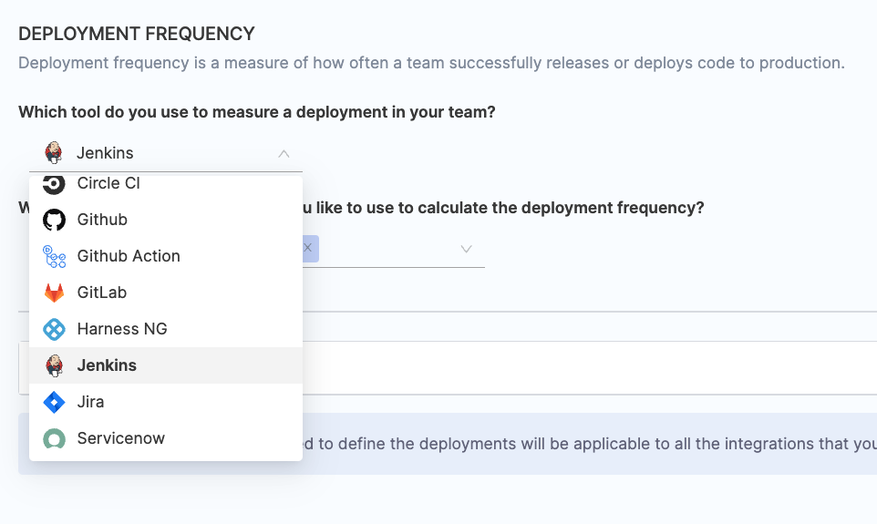 - Select the relevant Jenkins integrations that you wish to use for calculating change failure rate.