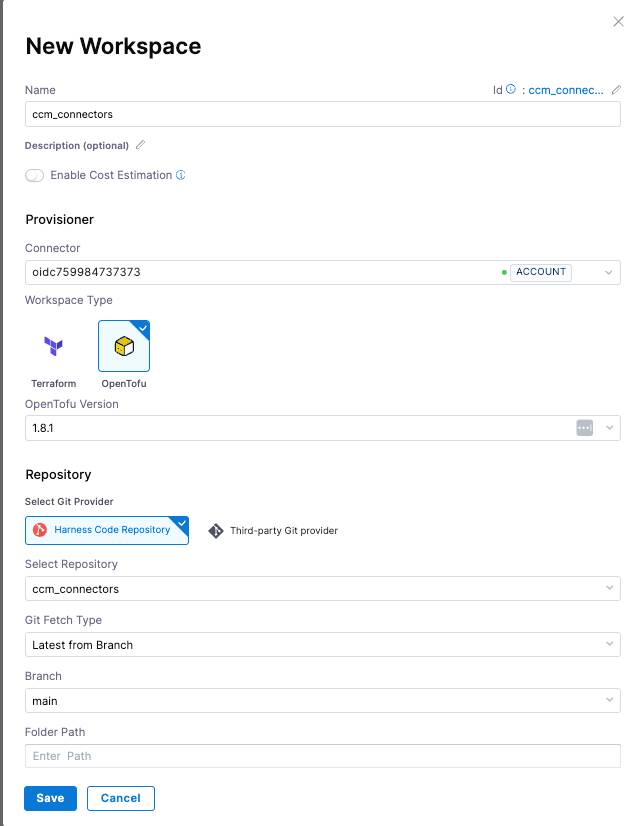 - Choose Harness Code Repository and select the repository we created in the first step. Select main as the branch and the folder path should be blank as we created the main.tf in the root directory.