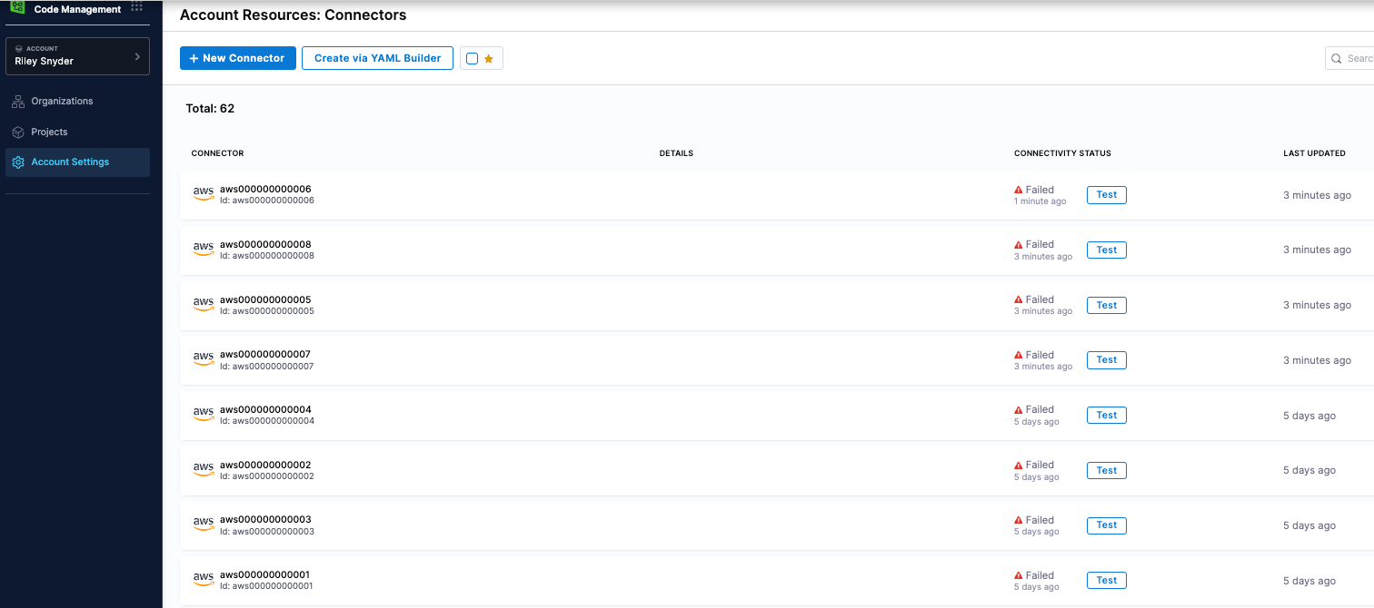 - After the pipeline is complete, navigate to connectors in account setting and verify the connectors created. In the screenshot below, the status is failed only because the IAM role I'm expecting isn't in the accounts yet.