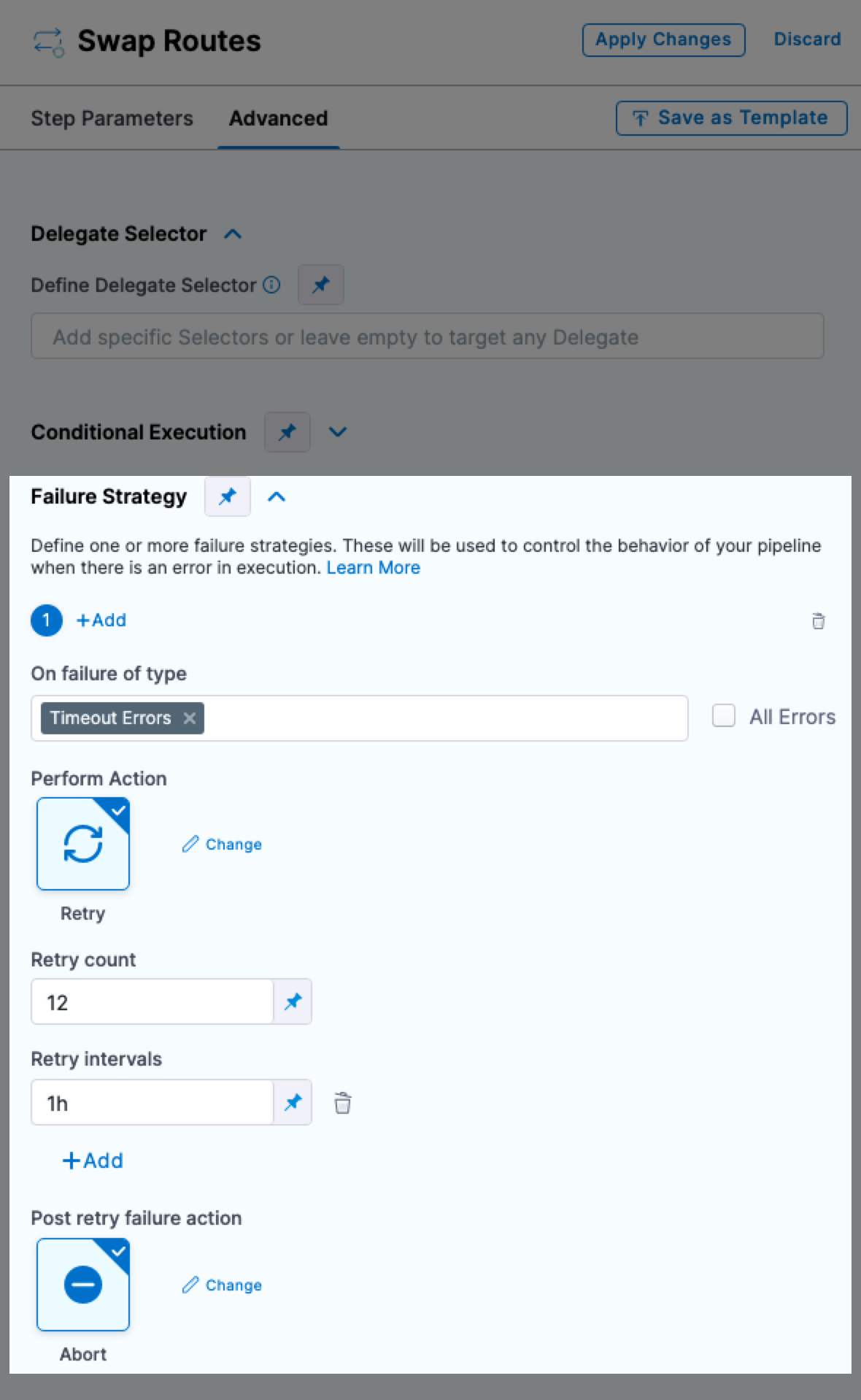 - Harness now provides pipeline rollback action in verify step failure strategies so users can choose rollback directly in advanced options. (CDS-114478, ZD-92214)